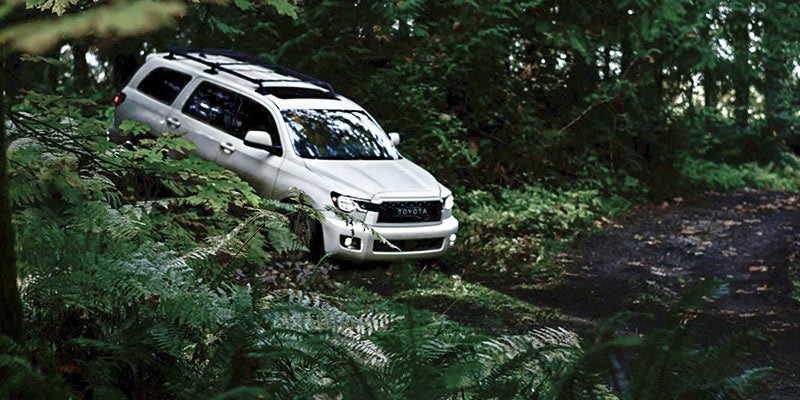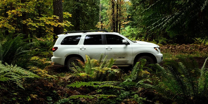 The SR5 starts the Sequoia line up with 18-inch wheels, a sunroof, LED headlights and fog lights, and heated side mirrors. The TRD Sport adds 20-inch TRD Sport wheels, black exterior trim elements, a roof rack, and sport-tuned Bilstein dampers. Step up to the TRD Pro to add skid plates, Rigid Industries LED fog lights, 18-inch BBS wheels, and black running boards, or to the Limited for 20-inch wheels and chrome exterior trim elements. The Platinum sits at the top of the Sequoia lineup with an adaptive air suspension, a chrome grille, 20-inch wheels with silver accents, and chrome side mirrors with integrated puddle lamps.